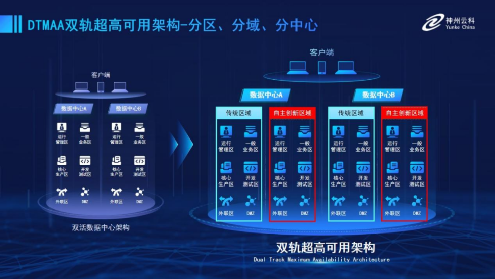 为帮助金融客户更好地应对数字经济时代对可持续性的高要求,实现“信创”与“数字化”齐头并进,凯发K8推出了双轨超高可用架构。该架构在双活数据中心的分区调度基础上,增加信创域和非信创域的分域调度,实行信创域与传统域应用全量部署,使双中心运营变为双中心四区域并行运行,互为多活,将“0到1”的单轨建设道路变为分区分域协同的多活双轨超高可用架构。帮助客户在新架构下,保障“信创”的同时解决性能瓶颈,提升稳定性,保证应用可持续性,最终实现信创区域和非信创区域的平滑过渡,完成国产化替代目标。